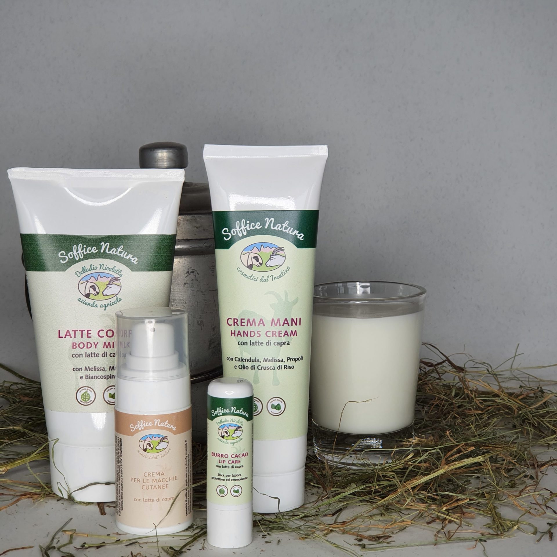 Acquista il Kit Soffice Inverno per rendere la tua pelle morbida e idratata con la Crema Mani da 100 ml, il Latte Corpo da 150 ml, il Burro Cacao naturale e la Crema Macchie Cutanee.